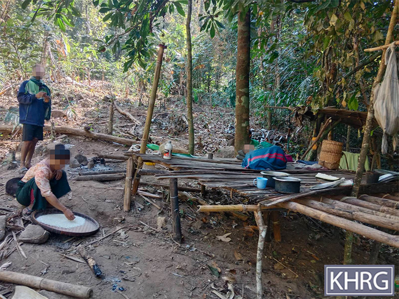 These two photos were taken in February 2025 in the forest near R--- village, Kyaw Pa village tract, Bu Tho Township, Mu Traw District. These photos show displaced R--- villagers. They are staying in the forest due to the SAC air strike that happened on January 28th 2025 in R--- village and on the nearby W--- village. [Photos: KHRG]