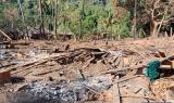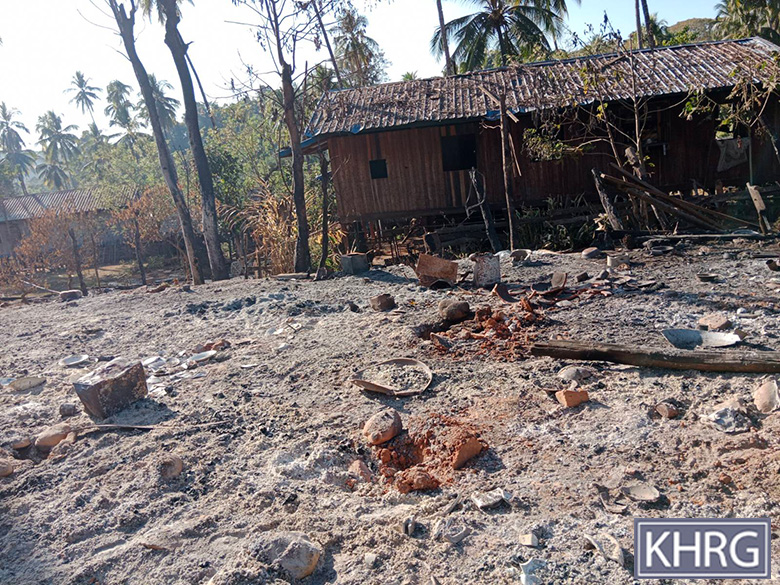 These photos were taken in February 2025 in W--- village, Kyaw Pa village tract, Bu Tho Township, Mu Traw District. These photos show the remains of the five houses that were burned down and destroyed by the SAC air strike conducted on January 28th 2025 in W--- village. [Photos: KHRG]