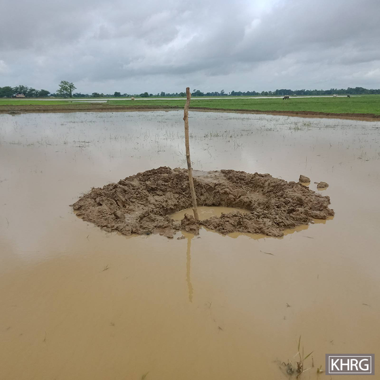 This photo was taken in June 2024 in Ay--- village, Moo special area, Moo Township, Kler Lwee Htoo District. SAC soldiers from LIB #307, based in Shwe Wa army camp, Moo special area, set up a temporary base in Az--- and Ba--- villages, also in Moo special area, and fired three 120 mm mortar rounds into Ay--- village on June 19th 2024. One of the shells landed on a villager’s paddy farm, damaging the paddies and increasing security risks for villagers working on a nearby farmland. The photo shows the farmland where the mortar shell landed. [Photo: KHRG]