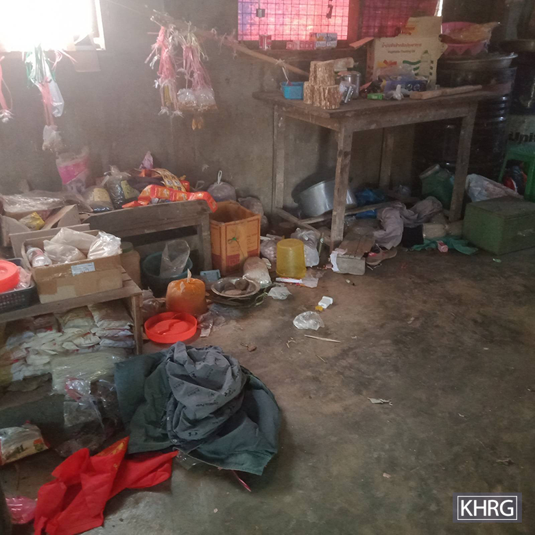 This photo was taken in March 2024 in Bp--- village, Moo special area, Moo Township, Kler Lwee Htoo District. On March 1st 2024, SAC soldiers from Light Infantry Division (LID)[19] #77 left Dq--- village, Moo special area, and went to Ler Doh Town, Ler Doh Township. The soldiers passed through multiple villages on their way, burning down several villagers’ houses in Ac--- village, Moo special area, and looting villagers’ possessions in Bp--- village. This photo shows one of the shops looted by SAC soldiers. [Photo: KHRG]