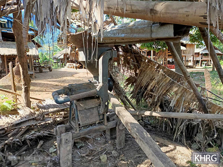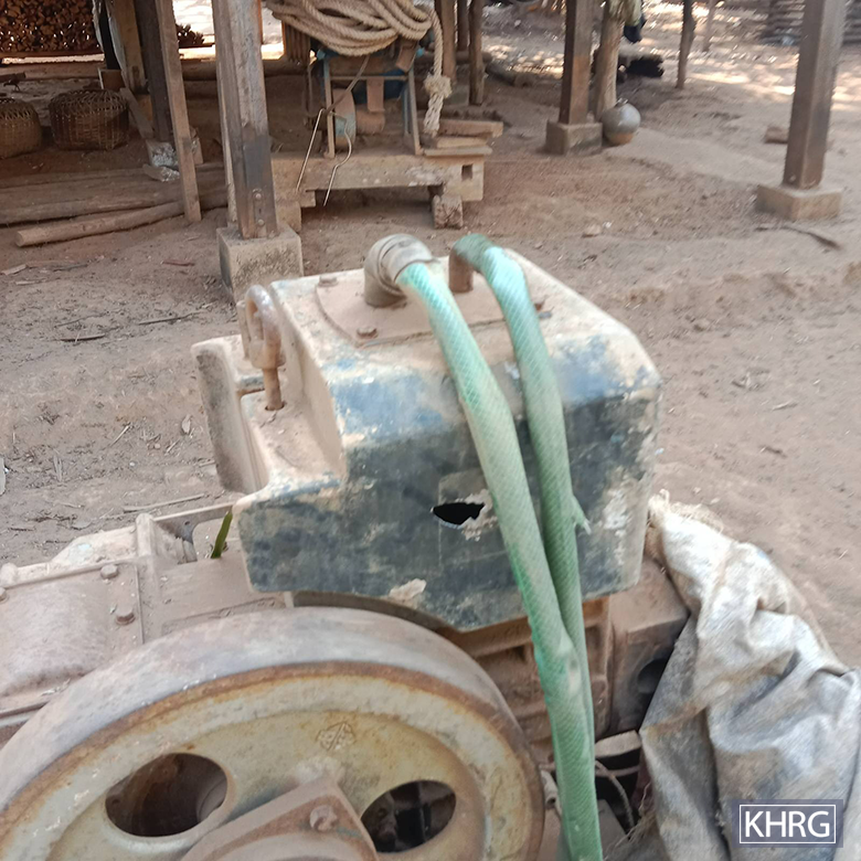 These photos were taken in November 2024 in Cb--- village, K’Ter Tee village tract, Dwe Lo Township, Mu Traw District. On November 24th 2024, at about 3 pm, an SAC troop based in K’Ser Ther Pler army camp shelled mortar rounds into Cb--- village. The shrapnel from the mortar explosion destroyed a rice milling machine and other tools owned by Saw Cc---, shown in the pictures. The mortar explosion also damaged two houses owned by Naw Cd--- and Saw Ce---. [Photos: KHRG]