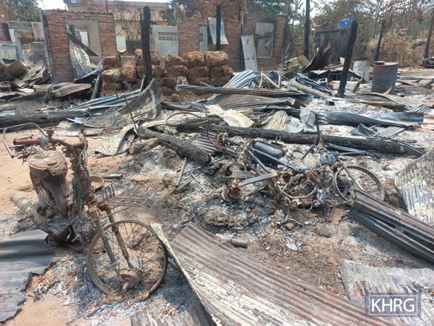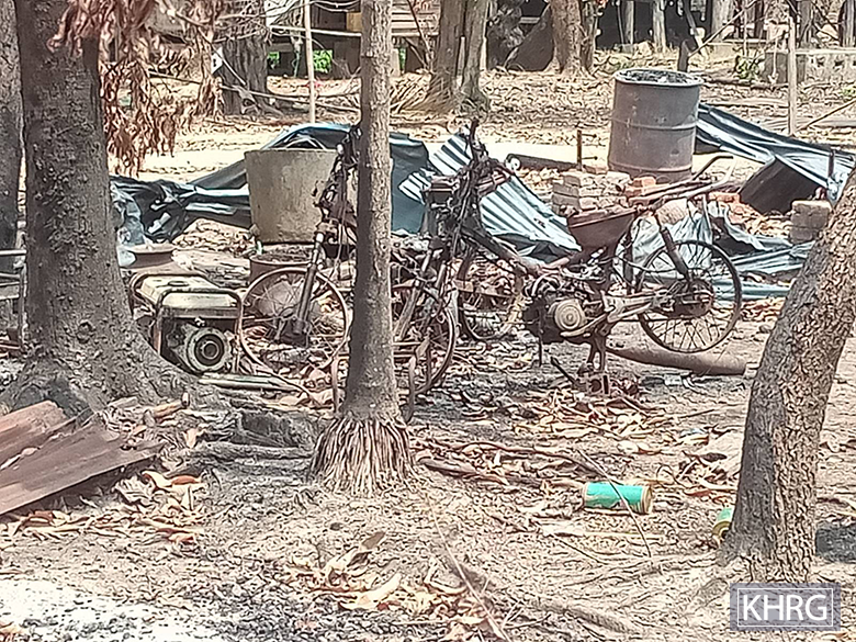 These two photos were taken in April 2024 in Ab--- village, Moo special area, Moo Township, Kler Lwee Htoo District. On the last week of February 2024, SAC soldiers from Shwe Wa army camp, in Moo special area, under LIB #439, #60 and #528, conducted military operations in villages, including planting landmines, shelling, and burning down houses. Many villagers’ houses in Ab---, Ac---, Ad---, and Ae--- villages were burned down. Villagers did not feel safe returning to their homes to access food and other necessities. Villagers were displaced in Ay--- village, Moo special area. The photos show Ab--- villagers’ houses and property, including motorcycles and machinery, burned down by SAC soldiers in February 2024. Additionally, on April 12th, a villager from Ac--- village was also injured after stepping on a landmine in Ab--- village, while transporting essential livelihood items, such as rice and other basic food supplies and materials like blankets, pots, and a pan. [Photos: KHRG]