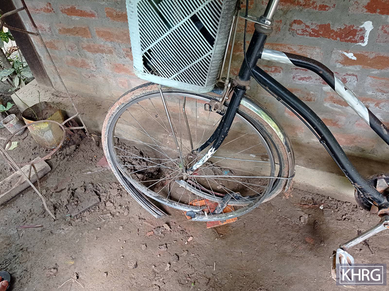 This photo was taken in August 2024 in Ch--- village, Htoo Wah Seh village tract, Ler Doh Township, Kler Lwee Htoo District. On August 8th 2024, SAC IB #264 fired 155 mm mortar rounds in Ch--- village. The shrapnel destroyed villagers’ property, including houses and other livelihood tools and means of transportation, such as a bicycle, as shown in the picture. [Photo: KHRG]