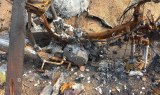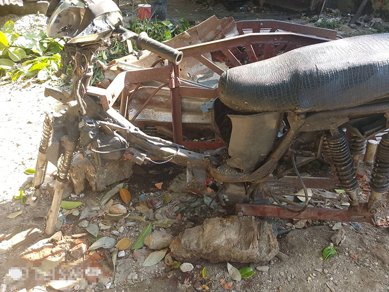 KHRG received this photo on December 22nd 2023. It was taken in By--- village, Aaw Poo area, Ler Mu Lah Township, Mergui-Tavoy District. Regardless of whether fighting occurred or not, SAC forces in Aaw Poo area frequently conducted indiscriminate shelling into civilian areas, forcing villagers to displace for their safety. Some villagers relocated to displacement sites, while others moved to safer areas near farms and plantations. On December 21st 2023, SAC soldiers from IB #285 fired about 80 mortar rounds into By--- village and surrounding farmlands. As a result of the heavy shelling, two villagers’ houses and a barn were burned down, along with all their possessions, and one villager sustained a head injury. The photo shows a villager’s multifunctional machine burned during the incident. [Photo: Local villager]