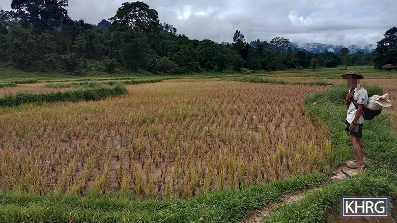 This photo was taken in August 2024 in Cy--- village, Htee T’Bluh Hta village tract, Dwe Lo Township, Mu Traw District. This photo shows one of the paddy farms in Cy--- village destroyed by an insect infestation, that turned the paddies reddish. Almost all farmers were affected by the infestation, resulting in a shortage of rice. Villagers attempted to control the outbreak by purchasing and spraying pesticide, but it was ineffective, and many crops were ultimately lost. In addition, villagers have been living under the ongoing security threat of SAC’s indiscriminate shelling and air strikes. As a result, they face serious concerns about food insecurity in the coming year. [Photo: KHRG]