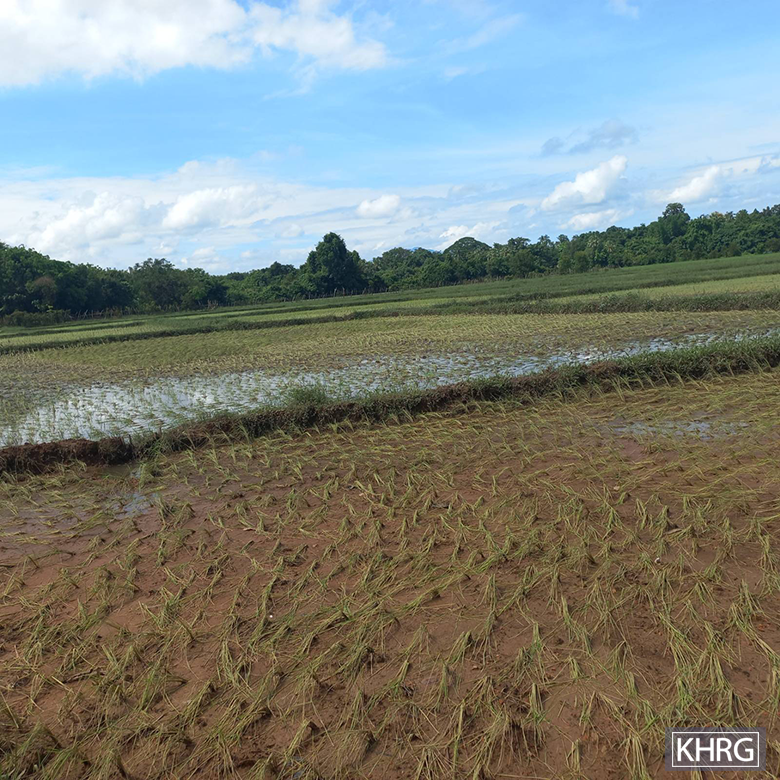 This photo was taken in August 2024, near Dw--- village, Ywa Tan Shin village tract, in Kaw T’Ree Township, Dooplaya District. The photo shows villagers’ farms in Ywa Tan Shin village tract, where many village tracts were affected by flooding in August 2024, including Aaw Hpa, Kaw Nweh, Kya K’Wa, T’Ray T’Kaw, and other village tracts.[32] [Photo: KHRG]