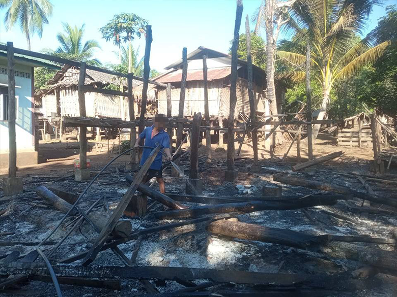 KHRG received these photos in December 2023. The photos were taken in Bk--- village, Aaw Pu area, Ler Mu Lah Township, Mergui-Tavoy District. On December 21st 2023, SAC IB #285 fired about 80 mortar shells, which landed on villagers’ plantations, causing a rice barn and two houses to burn down (as shown in the pictures). The owners lost all of their valuable possessions in the fire. The SAC often fired mortars indiscriminately into the village, so villagers had to move to a displacement site, while some moved to plantations considered safe. [Photos: Local villager]