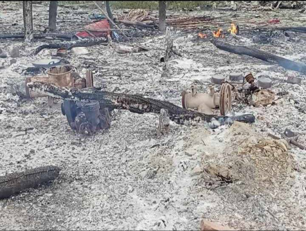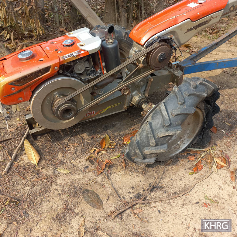 This photo was taken in March 2025 in Bt--- village, Mway Twin village tract, Moo Township, Kler Lwee Htoo District. On March 11th 2024, SAC LIB #599, known as Ton Taw Battalion, set fire to the bushes near their army camp to clear the area. The fire spread to Bt--- and Bu--- villages, where 42 villagers’ houses burned down. The fire reached the village while villagers were displaced to another area due to earlier shelling that had caused deaths and injuries. When villagers at the displacement site saw smoke rising from their village, they tried to return to extinguish the flames and protect their houses and properties. However, they were unable to save all of them. The photo on the left shows a burned tractor, while the photo on the right shows a burned farming machine engine used for livelihood activities. Many farming machines and tools were lost in the fire. [Photos: KHRG]