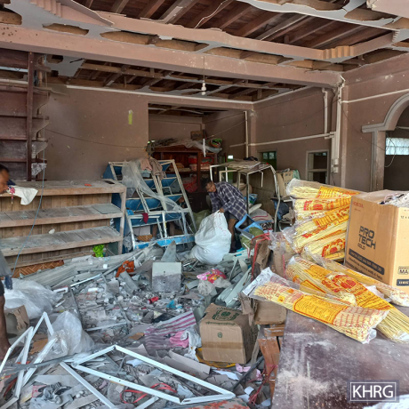 This photo was taken in March 2024 in Bo--- village, Kyaw Hkee village tract, Kaw T’Ree Township, Dooplaya District. On March 18th 2024, an SAC fighter jet dropped two 500-pound bombs on the village. The bombs’ explosions killed two villagers and injured a girl on the hands. It also damaged and destroyed several houses and shops. This photo shows one of the villagers’ stores, where the entire stock, including food, was destroyed. [Photo: KHRG]