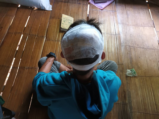 This photo was taken on November 25th 2024 in Dt--- area, Daw Hpah Hkoh Township, Taw Oo District. The photo shows an injured villager, named Ko[31] Co--- (33 years old), who is a driver from Cp--- area. On November 25th 2024, Ko Co--- was driving a bus from Toungoo Town to Yay Thoe Lay Town. When he reached Cp--- area, he was forced to stop by the SAC soldiers (around six soldiers, who were not in full uniform) and told him to get out of the car. They were aiming at him with their guns the whole time. As soon as he got off the car, the soldiers ordered him to lay flat on the ground and a soldier beat him on his head with a gun. The soldiers also robbed his phone and took approximately 150,000 kyat [71.43 USD] from him. The soldiers also kicked the bus fare collector, a 21-year-old, with such force that he was knocked under the bus. The whole incident lasted about three minutes, after which they let him go. He sustained a severe head injury and went to Cq--- clinic for medical treatment, where he received eight stitches. He had been working as a driver at Cr--- area to earn a living. On that day, around five buses were robbed. [Photo: Local villager]