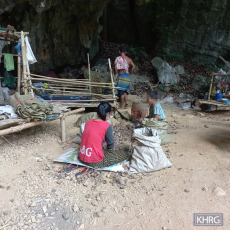 These two photo were taken in April 2024 in a cave where villagers were displaced in Noh Hsoo Neh village tract, Waw Ray Township, Dooplaya District. Villagers are displaced after an air strike was conducted by the SAC in Noh Ber Baw village tract, Waw Ray Township, on 12th March 2024. The photo on the left shows villagers who brought their store stock to the displacement site and continued running a small shop to support their livelihoods. The photo on the right shows villagers husking betel nuts, which they had brought to the displacement site to help meet part of their livelihood needs. [Photo: KHRG]