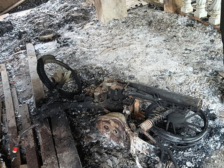 KHRG received these photos from a local villager on July 27th 2025. They were taken in A--- village, Way Htoo village tract, Daw Hpah Hkoh Township, Taw Oo District. On July 5th 2025, SAC soldiers burned down 39 houses and two motorbikes in A--- village, owned by local villagers, after clashes with PDF troops. The four photos on the first and second rows show villagers’ houses, completely burned down by the SAC soldiers. The two photos on the third row show two villagers’ motorbikes, destroyed by the SAC troops’ arson attack. [Photos: a local villager]