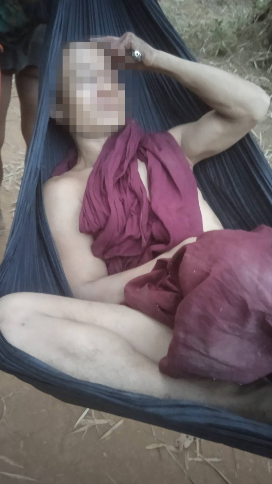 This photo was received from a local leader on March 22nd 2024, and taken in Vv--- village, Ma Htaw village tract, Dwe Lo Township, Mu Traw District. This photo shows a monk, Saw O---, who was injured on his head due to the SAC air strike on March 22nd 2024, in Aa--- village, Meh Klaw village tract, Bu Tho Township. The monk was walking inside the monastery compound when struck. When the photo was taken, he was being carried on a hammock on the way to Hh--- hospital, located in Pay Kay village tract, Lu Thaw Township, Mu Traw District. [Photo: Local villager]