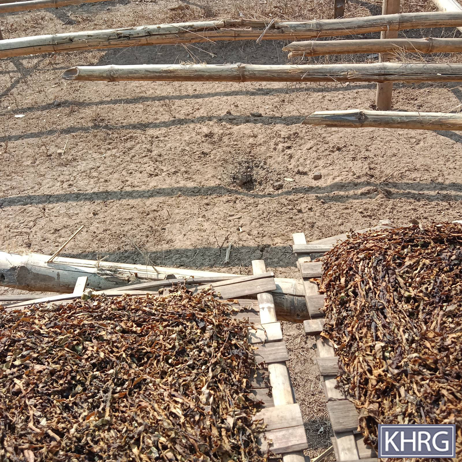 These photos were taken in March 2024. The photo on the left was taken in Kk--- village, Ma Htaw village tract, Dwe Lo Township, Mu Traw District, and the photo on the right was taken in Aa--- village, Meh Klaw village tract, Bu Tho Township, Mu Traw District. The photo on the left shows Naw W--- (38 years old), a villager from Aa--- village, who was injured on her left hip due to the SAC air strike conducted on March 22nd 2024 into Aa--- village. The photo on the right shows tobacco drying racks, of the same villager, that were damaged due to the air strike. [Photos: KHRG]