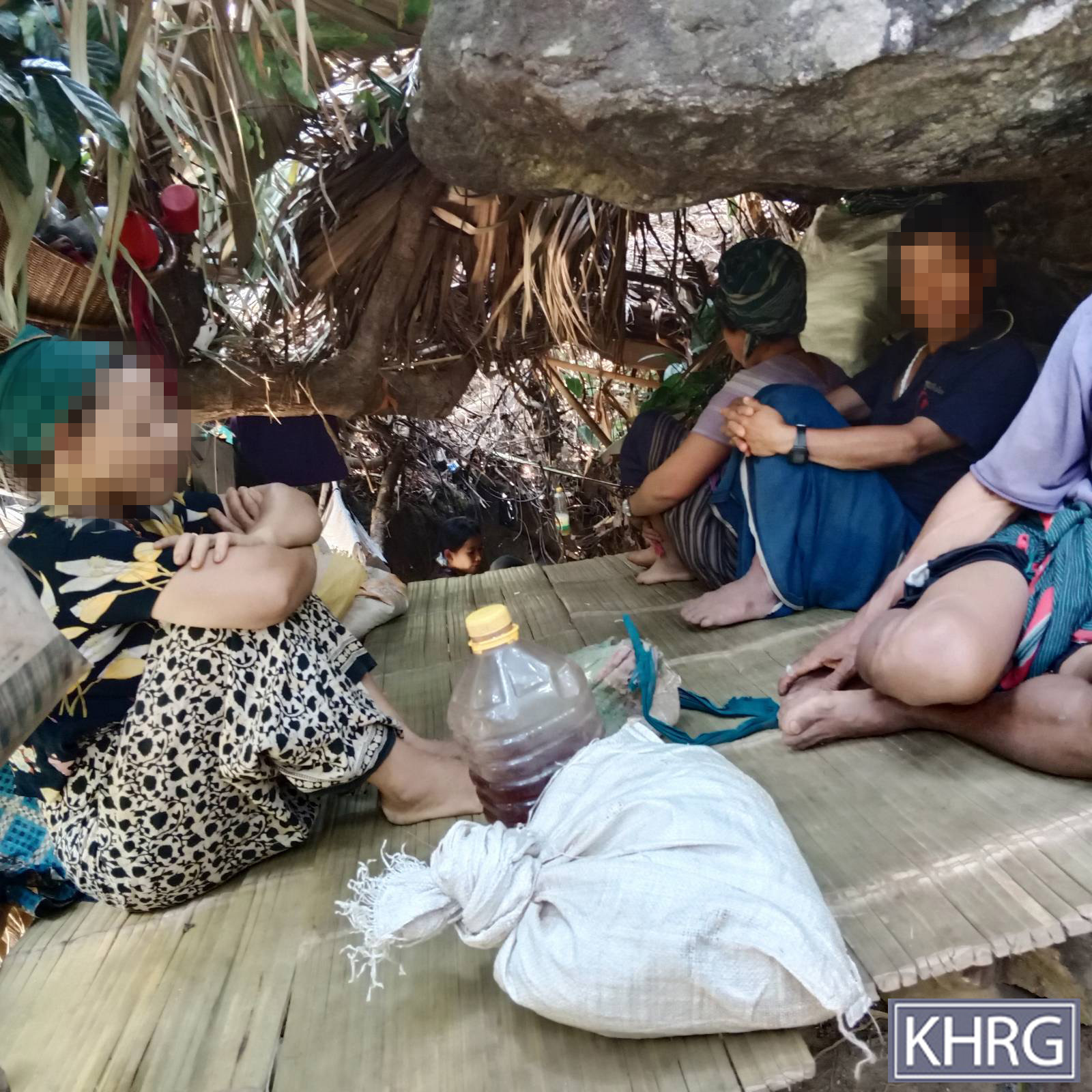 This photo was taken in March 2024, in Meh Klaw village tract, Bu Tho Township, Mu Traw District. This photo shows villagers from Meh Klaw village tract who fled to the forest, hiding in a cave due to the air strike that happened on March 27th 2024, in Aa--- village, Meh Klaw village tract. [Photo: KHRG]
