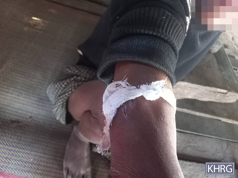 On January 24th 2026, the Burma Army carried out an air strike on Aa--- village, Mya P’Go village tract, Moo special area, Moo Township, Kler Lwee Htoo District. Due to the air strike, one villager was killed and two villagers were injured. Additionally, three villagers’ houses and the village monastery were damaged. The four photos above were taken by a KHRG researcher in February 2026. The photo on the bottom right shows U A---’s injury to his right arm after getting discharged from the clinic. The photo on the top left is Daw O---’s house, the top right is U B---’s house, and the bottom left is U A---’s house. These three photos show the damages caused to the villagers’ houses as a result of the Burma Army’s air strike. [Photos: KHRG]