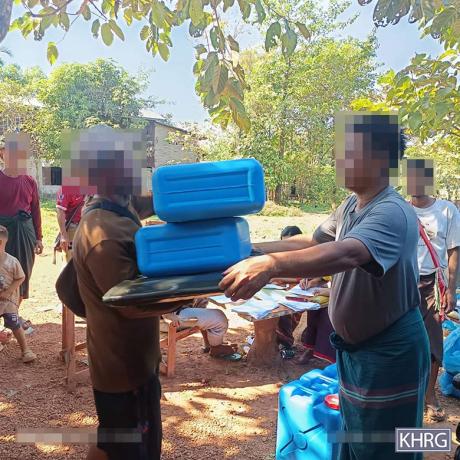 These photos were taken in December 2025, in Ae--- village, P’Ta village tract, Ta Kreh Township, Hpa-an District. These photos show the Committee for Internally Displaced Karen People (CIDKP) providing water containers and tarpaulins to villagers who were displaced in Ae--- village. [Photos: KHRG]