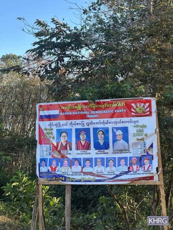 This photo was taken in December 2025, in the area near Ta Kreh Town, Ta Kreh Township, Hpa-an District. This photo shows a signpost campaign of three parties beside a vehicle road: Karen National Democratic Party (KNDP), Plone-Sgaw Democratic Party (PSDP), and Union Solidarity and Development Party (USDP). [Photo: KHRG]