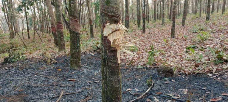 These photos were received on March 4th 2025 from a villager living in Bc--- village, Yaw Kuh village tract, T’Nay Hsah Township, Hpa-an District. The villager took the photos on the morning of February 28th 2025, at U S---’s rubber plantation near Bc--- village. On February 27th 2025, SAC forces, based at Hlaing Wa Artillery Unit #97, fired 120 mm shells, including incendiary weapons, which burned U S---’s rubber plantation. The photos show the damage to the plantation. [Photos: Local villager]