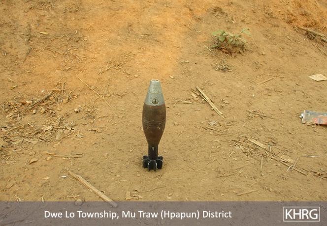 အထက်ပါပုံများသည် ၂၀၁၈ ခုနှစ် မတ်လ ၂၈ရက်နေ့ ဖာပွန်ခရိုင်၊ ဒွယ်လိုးမြို့နယ်၊ လေးဖိုးထကျေးရွာအုပ်စု၊ င--- ရွာ အနီးနားတွင် ရိုက်ယူခဲ့သည်။ ပုံတွင် ၂၀၁၈ ခုနှစ် မတ်လ ၁၅ရက်နေ့တွင် တပ်မတော် ခြေမြန်တပ်မ အမှတ်(၂၂) လက်အောက်ခံ ခြေမြန်တပ်ရင်း အမှတ် (၂၀၃) ခြေမြန််တပ်ရင်း အမှတ် (၂၀၃) နှင့် KNLA တပ်ရင်းအမှတ် (၁၀၂) လက်အောက်ခံ KNLA တပ်ခွဲအမှတ (၃) ကြား တိုက်ပွဲများဖြစ်ပွားနေသည့်အချိန်တွင် တပ်မတော်ဖက်က ပစ်ခတ် ခဲ့သော မပေါက်ကွဲသေးသည့် ၈၁မမ လက်နက်ကြီး ကျည်ဆံတစ်လုံး၏ပုံဖြစ်သည်။ (ဓာတ်ပုံများ - KHRG)