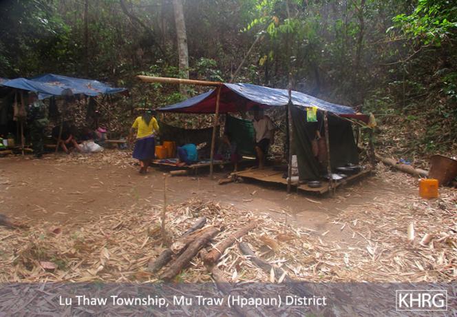 အထက်ပါပုံများသည် ၂၀၁၈ခုနှစ် မတ်၊ ၁ရရက်နေ့ ဖာပွန်ခရိုင်၊ လူသောမြို့နယ်၊ လယ်မူပလောကျေးရွာအုပ်စုတွင် ရိုက်ယူခဲ့သည်။ ပုံတွင် လယ်မူပလေားကျေးရွာအုပ်စုရှိ အမျိုးသမီးများနှင့် ကလေးသူငယ်များအပါအဝင် ရွာသားများ သည် တပ်မတော်မှ ၎င်းတို့ရွာများအား အကြမ်းဖက်တိုက်ခိုက်ခြင်းကြောင့် ၎င်းတို့၏အိုးအိမ်များကို စွန့်ခွာရွှေ့ပြောင်းကြ ရပြီး တောထဲတွင် သွားရောက်ပုန်းအောင်းနေထိုင်ခဲ့သည်။ တပ်မတော်တပ်များ၏လှုပ်ရှားမှုများနှင့် တိုက်ပွဲများဖြစ်ပွား ခြင်းကြောင့် ရွာသားများတိမ်းရှောင်ခဲ့ပြီးနောက်ပိုင်းတွင် ၎င်းတို့ယာယီတဲအိမ်စခန်းများကို ၎င်းတို့ဘာသာတည်ဆောက် ခဲ့ရသည်။ ၎င်းတို့၏တဲအိမ်များကို ပလက်စတစ်၊ သစ်ကိုင်းများနှင့် မိုးရေဒဏ်ကို တောင့်ခံနိုင်ခြင်းမရှိသည့် အခြားသော ကိရိယာများတို့ဖြင့်သာ တည်ဆောက်ခဲ့ရသည်။ (ဓာတ်ပုံများ- KHRG)