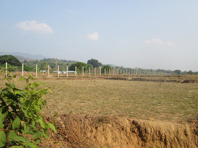ရွှေကုက္ကိုလ်မြို့ရှိ Chinatown တည်ဆောက်မှုစီမံကိန်းသည် ဆက်လက်ဖြစ်ပွားနေဆဲဖြစ်သည်။ ဒေသခံလယ်သမားများမှ ၎င်းတို့၏အမာခံမြေယာများကို ဈေးနည်းနည်းဖြင့်ရောင်းချရသည့်အ ကြောင်းရင်းမှာ နယ်ခြားစောင့်တပ်စစ်သားများ၏ ဖိအားပေးမှုကြောင့်ဖြစ်သည်။ [ဓာတ်ပုံ: KHRG]
