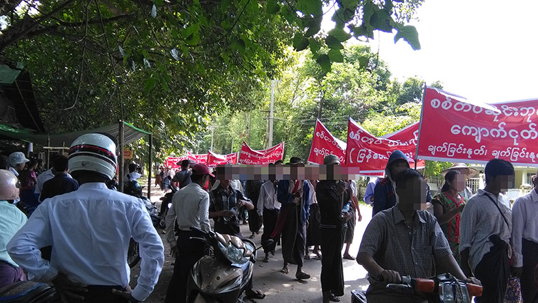 ဤဓာတ်ပုံတွင် ရှောက်ပင်ချောင်းရွာသားတို့သည် တပ်မတော်မှသိမ်းဆည်းထားသော စိုက်ပျိုးခြံများအားပြန်လည် ရရှိရေးနှင့် တပ်မတော်တို့၏ လုပ်ရပ်များကိုရပ်တန့်ရေးတို့ကို ဆန္ဒပြတောင်းဆိုကြသည့်ပုံဖြစ်သည်။ [ဓါတ်ပုံ: KHRG]