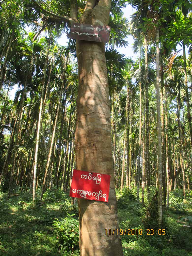 ဤသစ်ပင်များသည် ဝါးဇွမ်းဥရွာမှဒေသခံလယ်သမားများမှ စိုက်ထားခြင်းဖြစ်သည်။ ယခုတွင် တပ်မတော်စစ်သား များမှထိုသစ်ပင်များပေါ်တွင် ဆိုင်းဘုတ်များပြုလုပ်၍ ထိုသိမ်းဆည်းထားသောမြေများပေါ်တွင် "မကျူးကျော်ရ" ဟု ရွာသားများအားသတိပေးကြေညာထားသည့်ပုံဖြစ်သည်။ တပ်မတော်စစ်သားများသည် ထိုနေရာအား စစ်သင်တန်း လေ့ကျင့်ရန်အတွက် အသုံးပြုကြသည်။ ထို့ဖြစ်ရပ်ကြောင့် များစွာသောဒေသခံလယ်သမားများ၏ စိုက်ပျိုးပင်များကို ပျက်စီးစေသည်။ [ဓါတ်ပုံ: KHRG ]