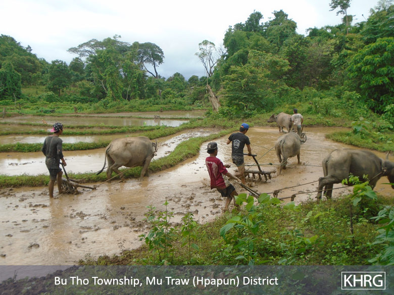 ဤပုံကို ၂၀၁၉ခုနှစ်၊ ဇူလိုင်လ ၂၃ရက်နေ့တွင် မူတြော်ခရိုင်၊ဘူးသို မြို့နယ်၊ မယ်ကလောကျေးရွာအုပ်စု၊ မယ်ကလောဒေကျေးရွာတွင် ရိုက်ယူခဲ့ပါသည်။ ရွာသားများသည် လယ်ယာစပါးစိုက်ပျိုးခြင်းဖြင့် ၎င်းတို့၏အသက်မွေးဝမ်းကျောင်းပြုကြသောပုံဖြစ်ပါသည်။ [ဓာတ်ပုံ - KHRG]