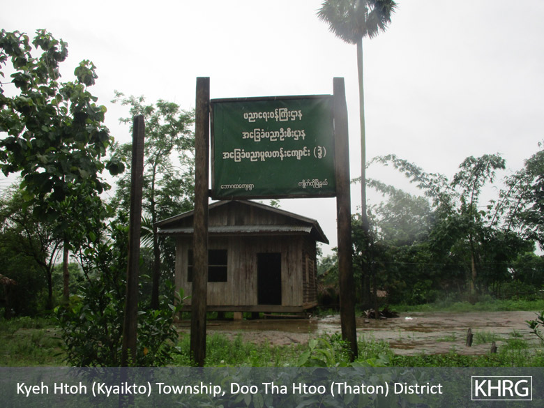 KNU/KNLA-PC မှ ၎င်းတို့၏ကျောင်းအတွက် အားကစားကွင်းဆောက်လုပ်ရန် သူမ၏လယ်ယာအနီးရှိမြေယာများကို သိမ်းဆည်းခဲ့ပါသည်။ ထို့နောက်သစ်ပင်များအားခုတ်လှဲပြီးမြေညှိခဲ့ကြပါသည်။ မြေသိမ်းဆည်းခံရသည့်အဆိုပါအမျိုး သမီးတွင် ကရင်အမျိုးသားအစည်းအရုံး (KNU) ၏မြေယာပိုင်ဆိုင်မှုတရားဝင်စာရွက်စာတမ်းရှိပါသည်။ သူမမှ KNU/ KNLA-PC ထံသို့မြေယာပိုင်မှုစာရွက်စာတမ်းပြခဲ့သော်လည်းအကျူံးမဝင်ခဲ့ပါ။ သူမ၏မြေယာဆုံးရှုံးခြင်းအတွက် မည် သည့်လျော်ကြေးမျှမရရှိခဲ့ပါ။ ဤကိစ္စအားကျေးရွာလူကြီးနှင့်မြို့နယ်အုပ်ချုပ်ရေးမှူးထံသို့တင်ပြခဲ့သော်လည်း သူမ အား မကူညီပေးနိုင်ခဲ့ကြပါ။