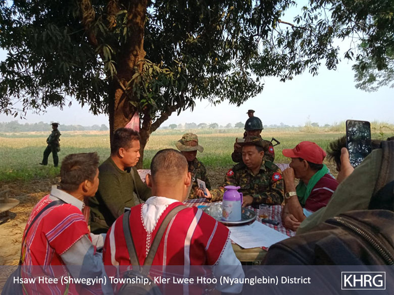 ဤဓာတ်ပုံများအား ၂၀၂၀ ခုနှစ်၊ ဖေဖေါ်ဝါရီလ ၂၄ ရက်နေ့ ခလယ်လွီထူခရိုင်၊ ဆောထိမြို့နယ်၊ အောပလားကျေးရွာအုပ်စု၊ အောပလား ကျေးရွာတွင် ရိုက်ယူခဲ့ခြင်းဖြစ်သည်။ လက်ဝဲဘက်ရှိပုံတွင် KNU ခေါင်းဆောင်များမှ ဦးဆောင်စီစဉ်သည့် NCA နှင့်ပတ်သက်သောအစည်း အဝေးအား တက်ရောက်လာသောရွာသားများ၏ပုံကို ဖော်ပြထားသည်။ လက်ယာဘက်ရှိပုံတွင် ထိုအစည်းအဝေးအား ရပ်တန့်စေခဲ့သော ခမရ အမှတ် (၁၂၄)မှ တပ်မတော်စစ်သားများကို ဖော်ပြထားသည်။ (ဓာတ်ပုံ - KHRG)