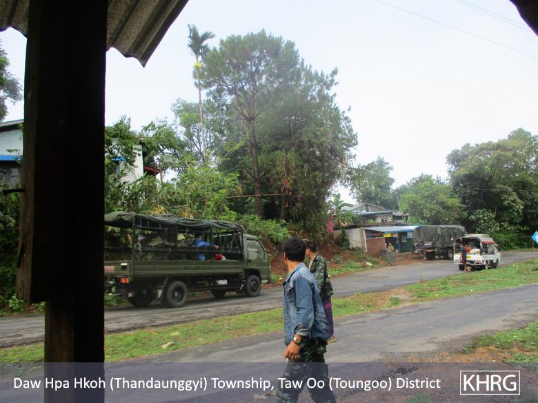 ဤပုံကို ၂၀၂ဝခုနှစ်၊ မေလ ၃ဝ ရက်နေ့ တောအူးခရိုင်၊ ဒေါ့ဖာခို့ (သံတောင်ကြီး) မြို့နယ်၊ တောပြာကြီးကျေးရွာအုပ်စု၊ ဇ---ကျေးရွာတွင် ရိုက်ယူခဲ့သည်။ ပုံတွင် ဇ---ရွာကို ဖြတ်သန်း၍ မောင်းနှင်လာသော တပ်မတော်စစ်ကားကြီးများ၏ ပုံဖြစ်ပါသည်။ ညာဘက်တွင်ရှိသော အဖြူရောင်ကားတစ်စီးသည် ရွာသားတစ်ဦး ပိုင်ဆိုင်သည့်ကားဖြစ်ပါသည်။ တပ်မတော်မှ ၎င်းတို့၏စစ်ပစ္စည်း တန်ဆာများကို သယ်ယူပို့ဆောင်ပေးရန်အတွက် ထိုရွာသားအား ခိုင်းစေခဲ့ခြင်းဖြစ်သည်။ (ဓာတ်ပုံ - KHRG)