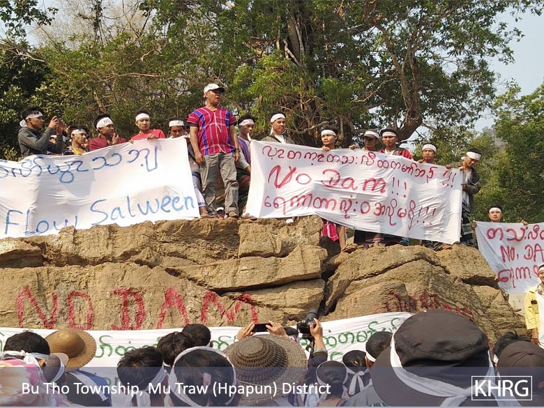 ဤပုံနှစ်ပုံအား ၂၀၂၀ ခုနှစ်၊ မတ်လ ၁၄ ရက်နေ့၊ မူတြော်ခရိုင်၊ ဘူးသိုမြို့နယ်တွင် ရိုက်ယူခဲ့ပါသည်။ ဤပုံများမှ သံလွင်မြစ်ကမ်းခြေတွင် မူတြော်နှင့် ဘားအံခရိုင်ရှိရွာသားများမှ ရေကာတာဆောက်လုပ်ရေးဆန့်ကျင်ဆန္ဒပြပွဲအား ပြုလုပ်နေကြသည်ကို ဖော်ပြထားသည်။ (ဓာတ်ပုံ - KHRG)
