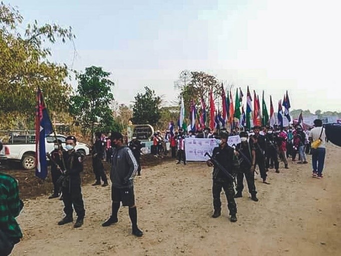ဤပုံကို ၂၀၂၁ ခုနှစ်၊ မတ်လ ၈ ရက်နေ့တွင် ရရှိခဲ့ပါသည်။ ဗြိတ်- ထားဝယ်ခရိုင်၊ လယ်ဒိုစိုးမြို့နယ်၊ ကမိုသွေးကျေးရွာအုပ်စုမှ ဒေ သခံရွာသားအယောက် ၁၀၀၀ ဝန်းကျင်မှ စစ်အစိုးရအားဆန့်ကျင် သည့် ဆန္ဒပြပွဲကို ပြုလုပ်ခဲ့ကြသည်။ စစ်ကောင်စီအစိုးရ လုံခြုံရေး တပ်ဖွဲ့များ၏ အကြမ်းဖက်မှုများမှကာကွယ်ရန် KNLA စစ်သား များမှ ဆန္ဒပြသူများနှင့်အတူ လိုက်ပါခဲ့ကြသည်။