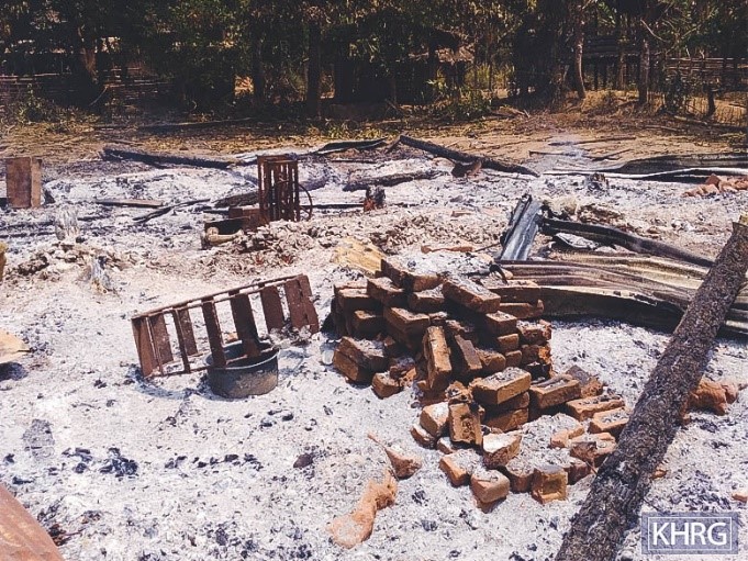 ဤပုံကို ၂၀၂၁ ခုနှစ်၊ ဧပြီလ မူတြော်ခရိုင်၊ လူသောမြို့နယ်၊ ပေ ကေးကျေးရွာအုပ်စု၊ ဒေ့ပူနို့ကျေးရွာတွင် ရိုက်ယူခဲ့သည်။ ပုံမှာ ၂၀၂၁ ခုနှစ်၊ မတ်လ ၂၇ ရက်နေ့တွင် SAC လေကြောင်းတိုက်ခိုက်မှု ကြောင့် ရွာသားများ၏အိုးအိမ်များနှင့် ပိုင်ဆိုင်မှုများ ပျက်စီးသွား သောပုံဖြစ်သည်။ (ဓာတ်ပုံ - KHRG)