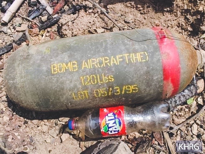 ဤပုံကို ၂၀၂၁ ခုနှစ်၊ ဧပြီလ မူတြော်ခရိုင်၊ လူသောမြို့နယ်၊ ပေ ကေးကျေးရွာအုပ်စုတွင် ရိုက်ယူခဲ့သည်။ ပုံမှာ ၂၀၂၁ ခုနှစ်၊ မတ်လ ၂၇ ရက်နေ့တွင် SAC ၏လေကြောင်းတိုက်ခိုက်မှု အတွင်း ပြုတ်ကျလာသည့် မပေါက်ကွဲသေးသော ပေါက်ကွဲမှု ပြင်းထန်သည့် ဗုံးတစ် လုံး၏ပုံဖြစ်သည်။ (ဓာတ်ပုံ - KHRG)