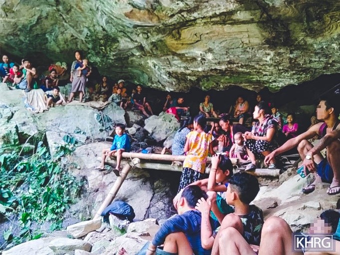ဤပုံကို ၂၀၂၁ ခုနှစ်၊ ဧပြီလ ၂၈ ရက်နေ့၌ မူတြော်ခရိုင်၊ ဘူးသိုမြို့ နယ်၊ ခဝ---ကျေးရွာအုပ်စုတွင် ရိုက်ယူခဲ့သည်။ ပုံတွင် ၂၀၂၁ ခုနှစ်၊ ဧပြီလ ၂၇ ရက်နေ့၌ နစကစစ်ဂျက်လေယာဉ်များမှ ဒေသ တွင်းဗုံးကျဲသောကြောင့် ဒေသခံကလေးများနှင့် ရွာသားများဂူထဲ တွင် ထွက်ပြေးတိမ်းရှောင်နေသည့်ပုံဖြစ်သည်။(ဓာတ်ပုံ - KHRG)