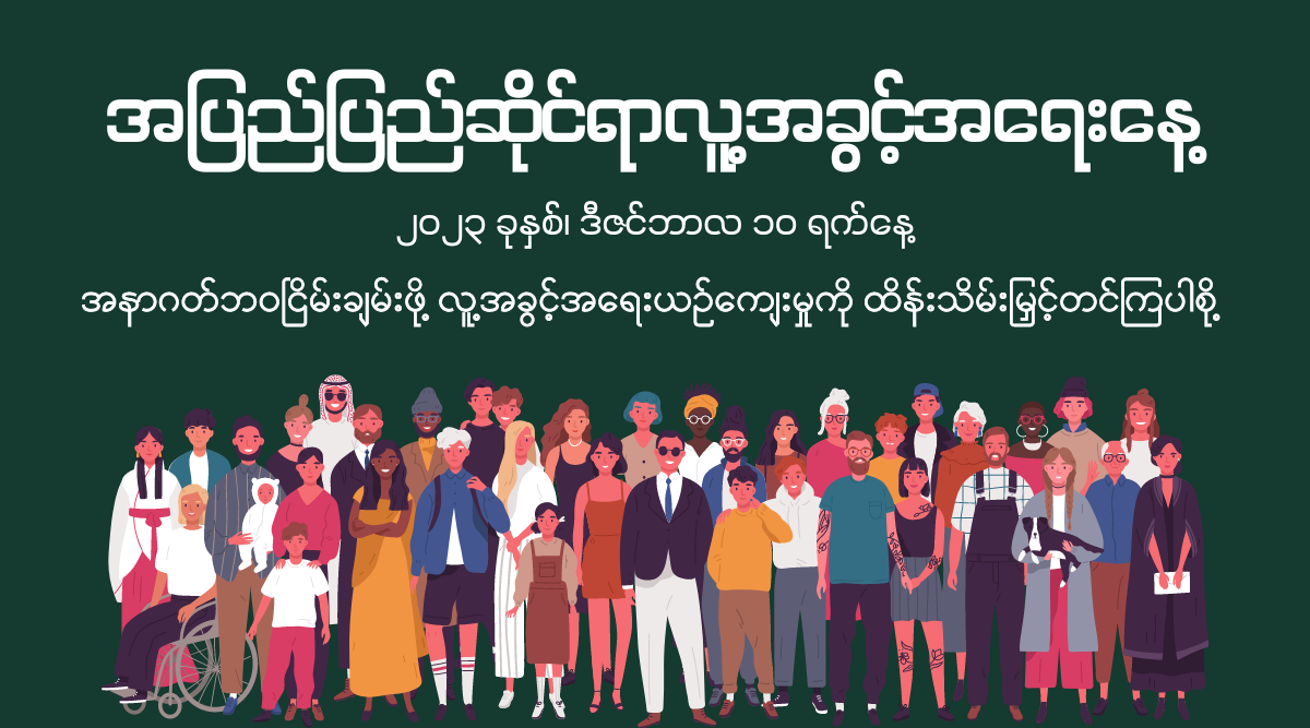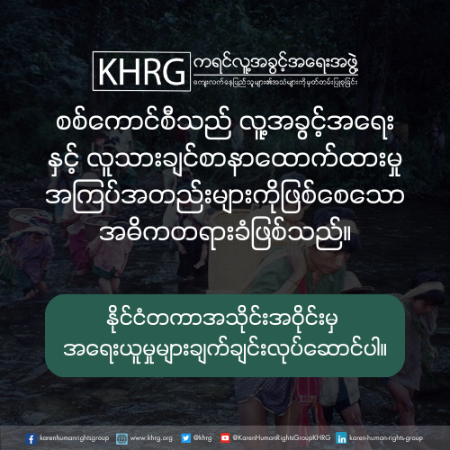 ယနေ့ကျရောက်သော အပြည်ပြည်ဆိုင်ရာလူ့အခွင့်အရေးနေ့တွင် ကျွန်ုပ်တို့ ကရင်လူ့အခွင့်အရေးအဖွဲ့(KHRG) သည် လူ့အခွင့်အရေးမြှင့်တင်ကာကွယ်ရန်အတွက် မယိမ်းယိုင်သောကတိကဝတ်များကို ထပ်မံအတည်ပြုပြီး မြန်မာပြည်သူများနှင့် အတူအကွ ရပ်တည်နေပါသည်။ ယနေ့အချိန်အခါထိ နိုင်ငံတော်စီမံအုပ်ချုပ်ရေးကောင်စီ (SAC) ၏ဦးဆောင်မှုအောက်ရှိမြန်မာစစ်တပ်သည် နိုင်ငံတစ်ဝှမ်းတွင် စစ်ရာဇ၀တ်မှုများ၊ လူသားမျိုးနွယ်အပေါ် ကျူးလွန် သည့်ရာဇ၀တ်မှုများနှင့် အခြားသောလူ့အခွင့်အရေးချိုးဖောက်မှုများကို ပုံစံအမျိုးမျိုးဖြင့် ပြစ်ဒဏ်ပေးခံရမှုလုံးဝမရှိဘဲ ဆက်လက်ကျူးလွန်နေဆဲဖြစ်ပါသည်။ လူ့အခွင့်အရေးချိုးဖောက်မှုများအပေါ် မြန်မာပြည်သူများ၏ရုန်းကန်နေရမှုများနှင့် ထိုချိုးဖောက်မှုများအားခုခံတွန်းလှန်ရာတွင် ၎င်းတို့၏ခံနိုင်ရည်ရှိမှုများအပေါ် အသိအမှတ်ပြုသောအနေဖြင့် ကျွန်ုပ်တို့သည် နိုင်ငံတကာအသိုင်းအဝိုင်းများအား မြန်မာပြည်၏ ဆိုးရွားလှသော လူ့အခွင့်အရေးချိုး ဖောက်မှုအခြေအနေများကိုအာရုံစိုက်စေလိုပြီး စစ်ကောင်စီများ၏ ရက်စက်ကြမ်းကြုတ်သောလုပ်ရပ်များအားအ ဆုံးသတ်စေရေးအတွက် ပူးပေါင်းလုပ်ဆောင်ကြပါရန် တောင်းဆိုလိုက်ပါသည်။